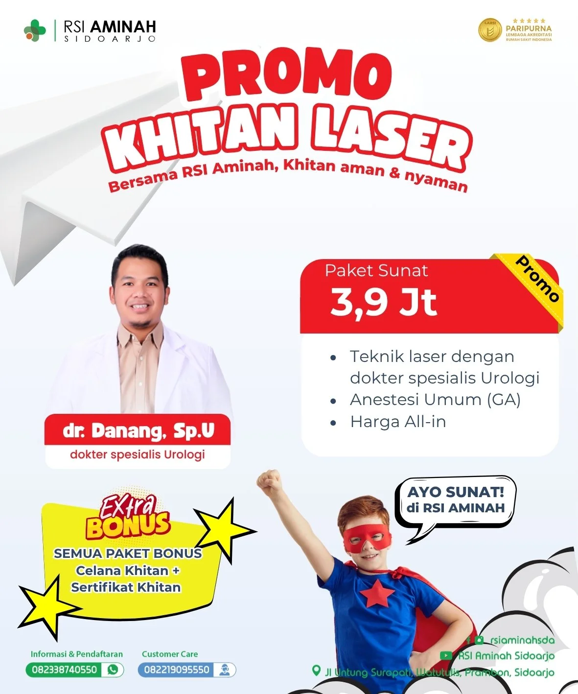 Jangan khawatir, RSI Aminah menyediakan pelayanan Paket Khitan loh. Khitan menggunakan metode dan peralatan modern, dilaksanakan oleh dokter yang berkompeten, dan si ganteng akan mendapatkan sertifikat, gift, dan fasilitas yang lainnya.
